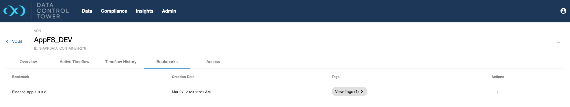 A list of all bookmarks generated on the selected VDB can be found under the "Bookmarks" tab. This page provides a list of all bookmarks allowing for general organization and actions (developers can use bookmarks as a refresh or provision point from the API).