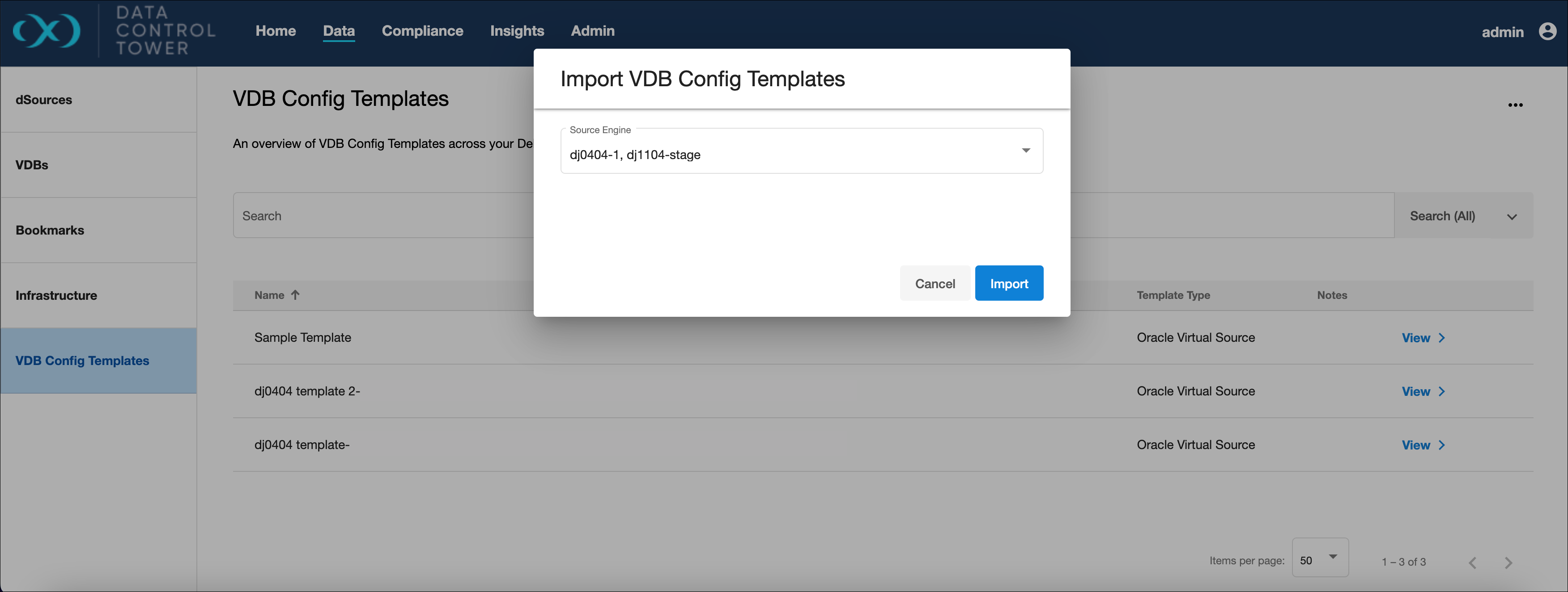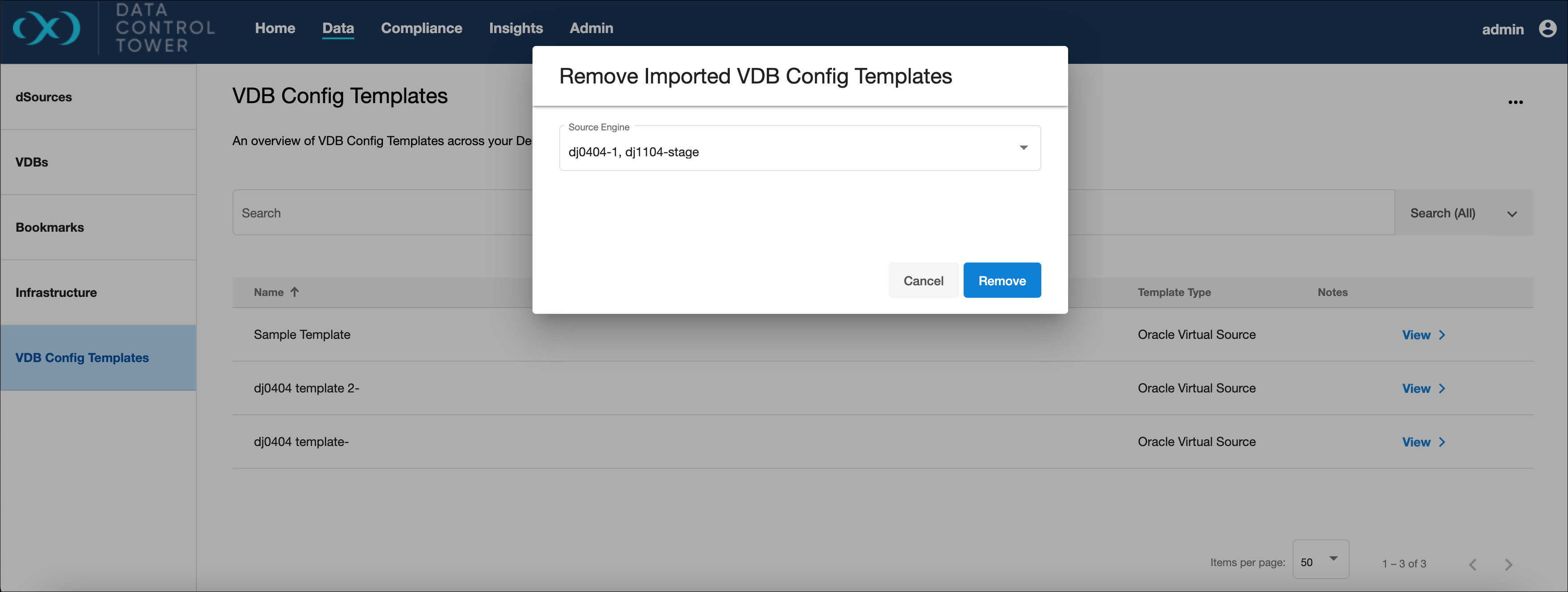 Importing and removing imported VDB templates from connected engines is an available action from the VDB Config Templates page.