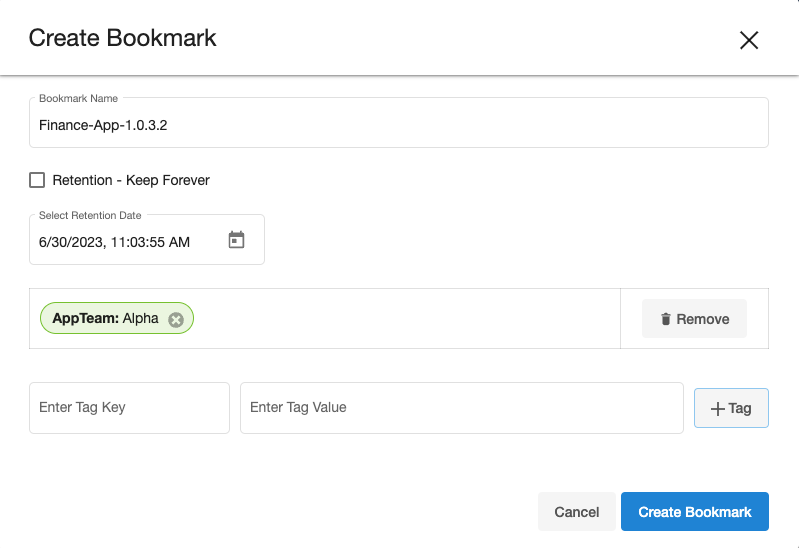 Selecting the "Create Bookmark" button will open a window that enables bookmark naming, setting the custom retention period for that bookmark, and assigning any relevant tags. Creating bookmarks this way will initiate a new snapshot operation that will then be associated with that bookmark.