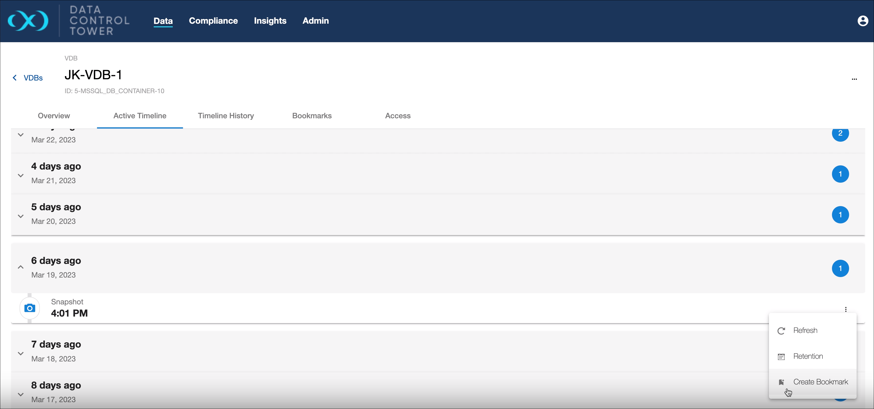 On the VDB detail page, under the Active Timeline tab for each snapshot, a Create Bookmark action is available. This opens a dialogue that shows a list of inputs for the user to select from, to create a bookmark.