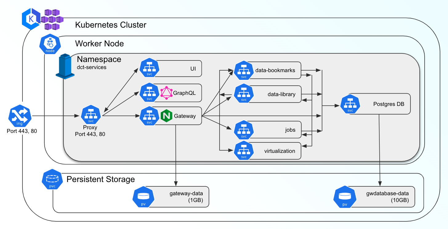 Data Control Tower is a container-based architecture and is currently certified with Kubernetes and OpenShift to align with common enterprise container standards. The DCT architecture is comprised of multiple micro-services that are each run on individual pods. This lends DCT to be a highly flexible and resilient deployment by enabling customers and IT organizations to enact their own backup, scaling, and resiliency standards associated with hosting container-based applications. Below is an architectural diagram of all the services that make up DCT as well as the persistent storage for maintaining relationship metadata.