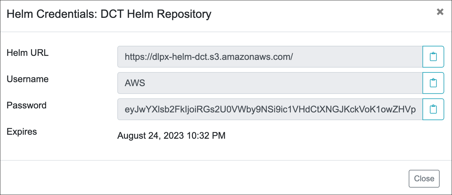 For getting the temporary credentials, visit the Delphix DCT Download page and login with your customer login credentials. Once logged in, select the DCT Helm Repository link and accept the Terms and Conditions. Use password from the popup screen, as shown below.