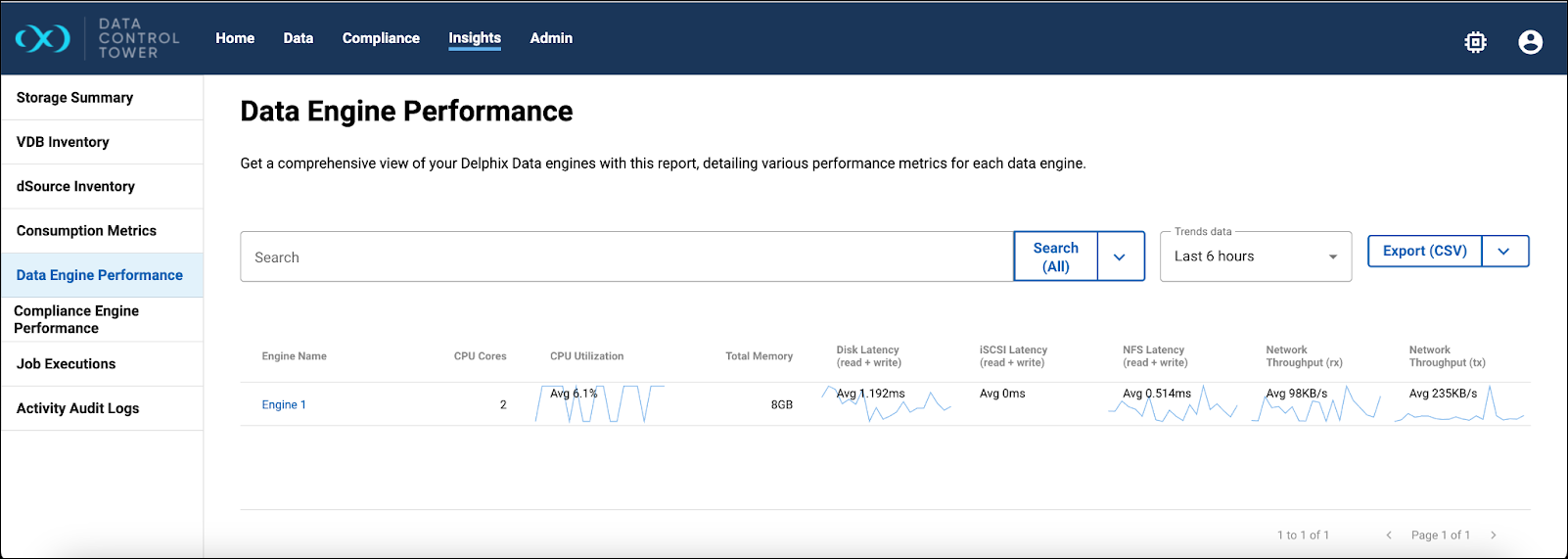 The Engine Performance dashboard provides users with a comprehensive view of performance information for Delphix Continuous Compliance Engines. The performance metrics include system CPU utilization, system memory usage, latency and throughput details for Disk protocols, and network throughput.