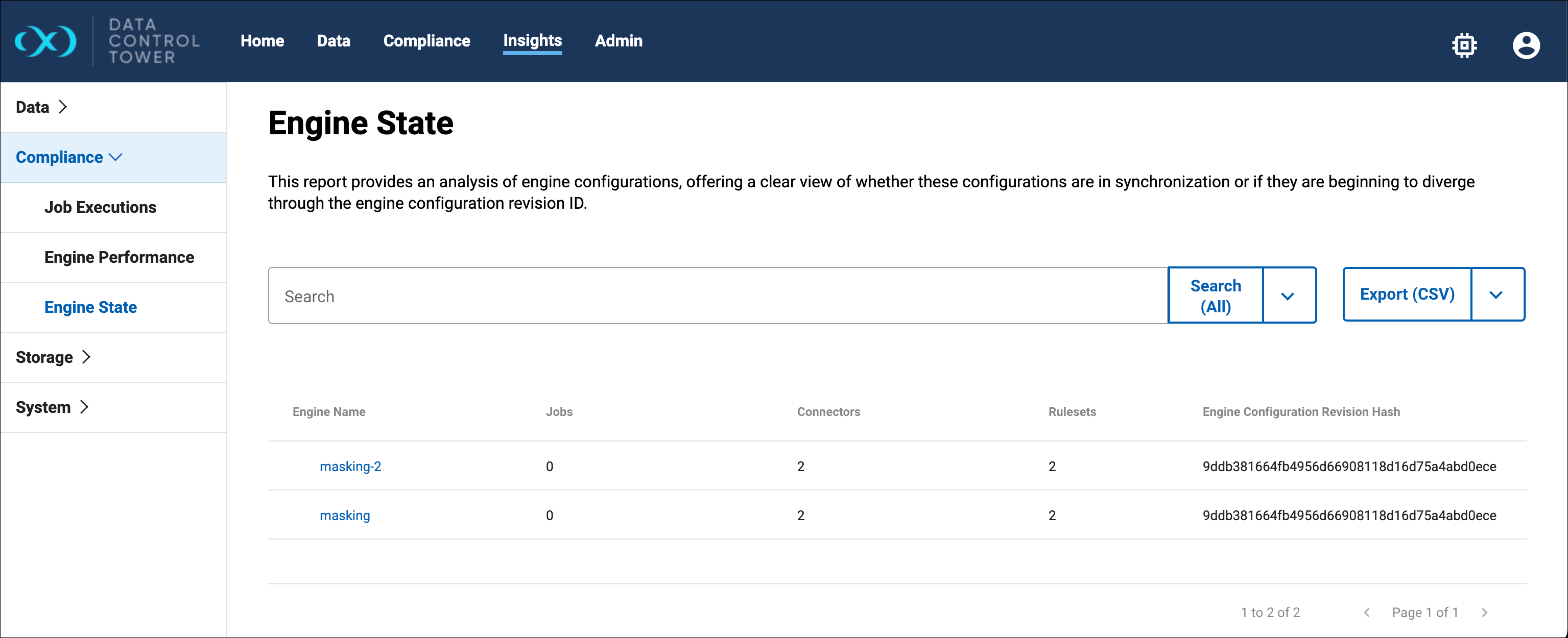 The Compliance Engine (Global) State report provides the users with an overview of which engines are in sync and can be used to horizontally scale a compliance job. The users should use the Engine Configuration Revision Hash (Global Object Revision Hash) to determine if engines are synced – they have identical global object like (algorithms, rule sets, domains, etc.). Search filtering and sorting can be used to find all engines that are in-sync, and also determine if an engine has fallen out of sync. If the user wants to take action by then syncing an un-synced engine, they can do so from the Hyperscale Orchestrators' details page via the Manually Deploy Job Dependencies action menu.