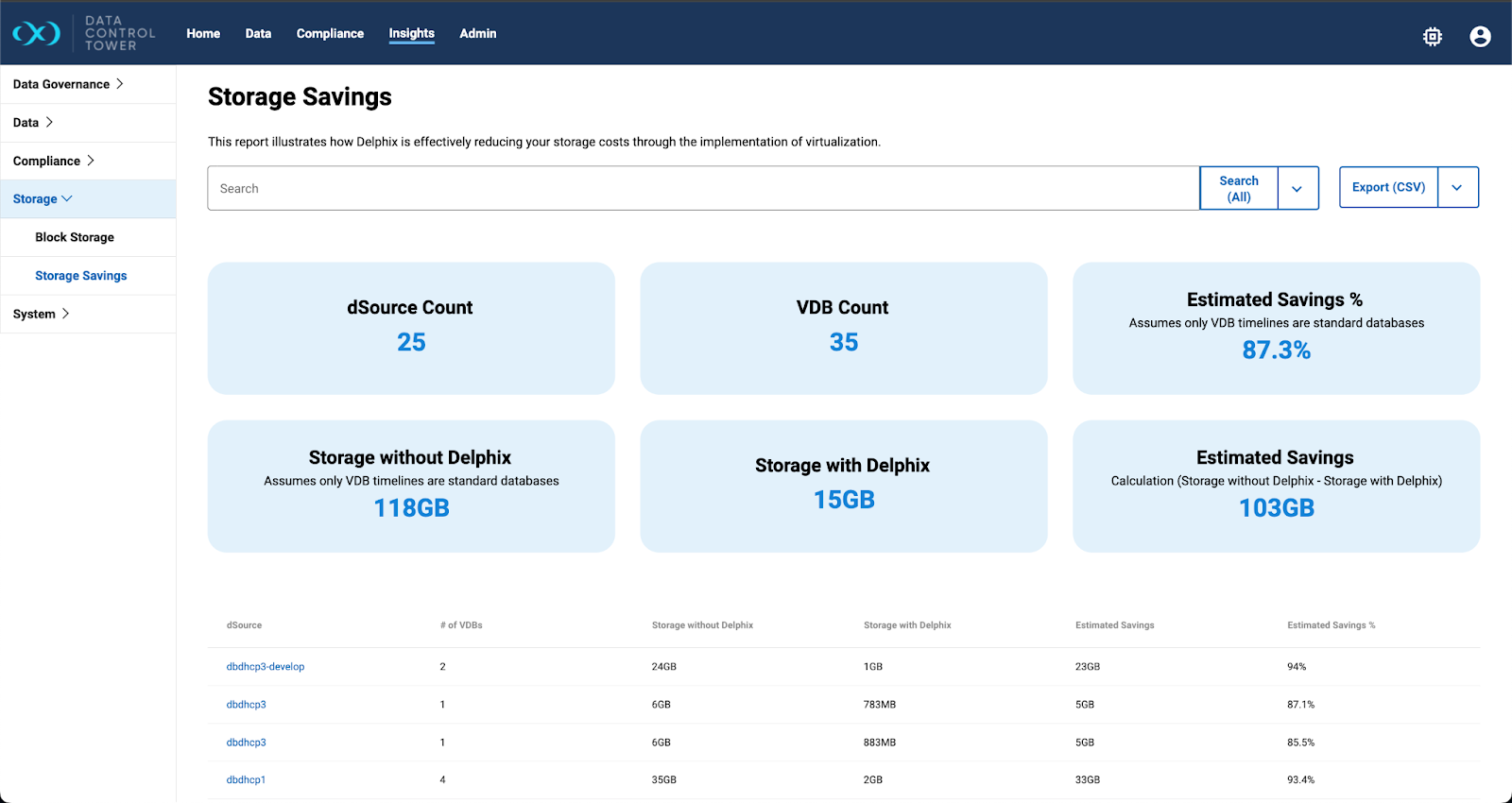 The Storage savings report illustrates how Delphix is effectively reducing storage costs through the implementation of data virtualization. The data in the table shows space metrics for each dSource and its child/descendant VDBs. The tiles above show the aggregates across all the pages of the table. The tiles will update to reflect the results in the table as the result of any search filtering.
