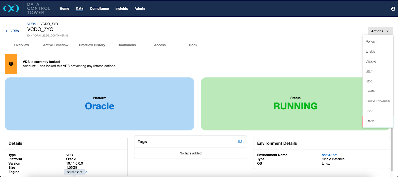 The VDB details page has the options to lock and unlock a VDB under the Actions menu. All VDBs are in the unlocked state by default, thus, the only option available at first is to lock the VDB.