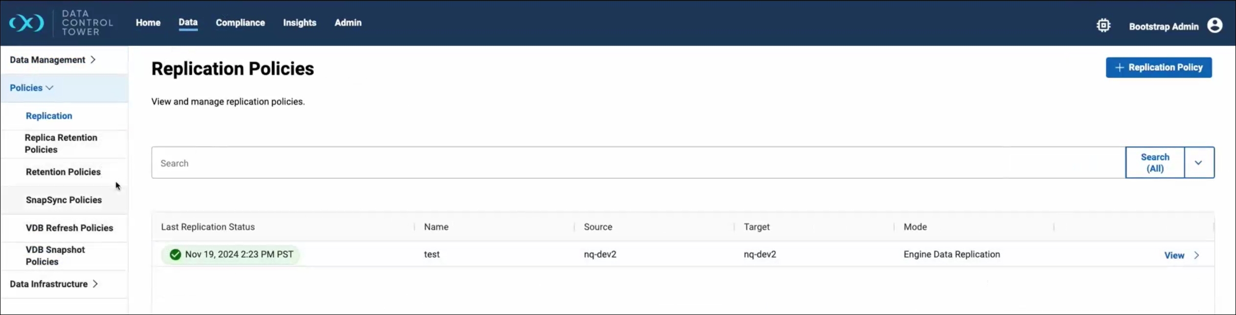 The Policies section in Data Control Tower (DCT) provides an organized and centralized view of all policies, including Replication Retention, Retention, SnapSync, VDB Refresh, and VDB Snapshot policies. This guide explains how to navigate, view, and manage them.