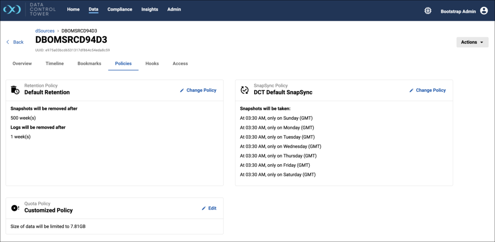 DCT-managed policies are centrally managed within DCT for deployment on multiple Delphix Continuous Data or Compliance Engines. These policies are identified by a DCT_Managed prefix in their name on the Delphix Engine itself, but the name in DCT will remain the same.